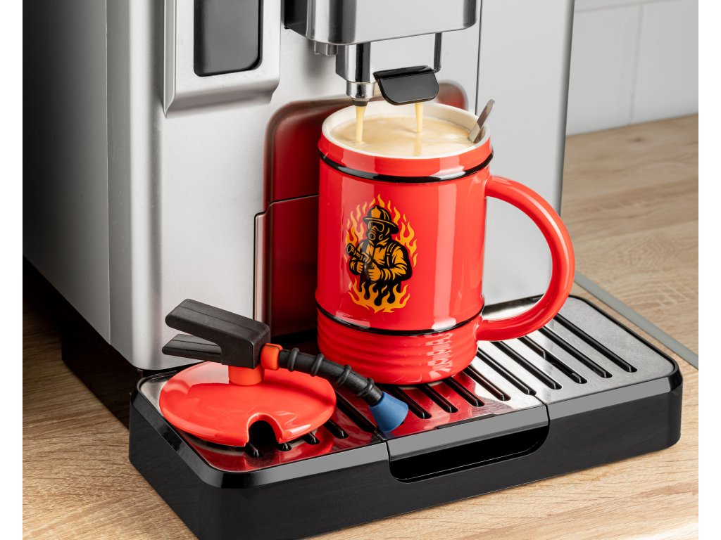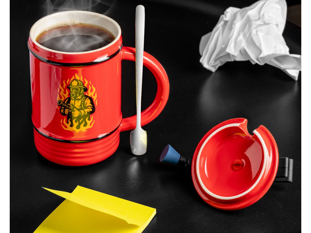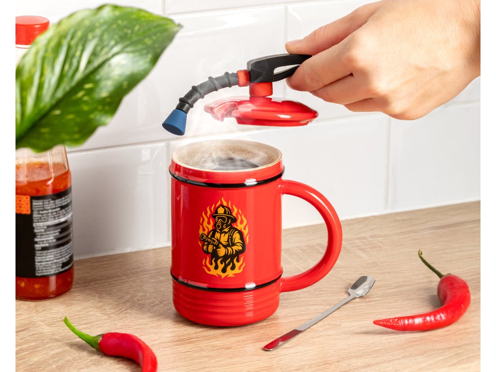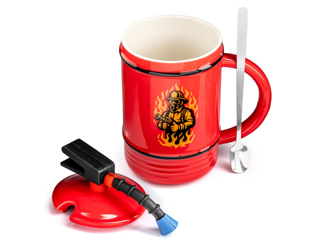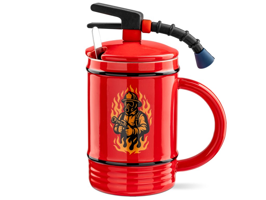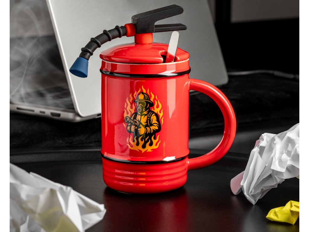 Tento hrnček vyzerá, akoby si si práve priniesol mini hasiaci prístroj na stôl. Detailné spracovanie, potlač hasiča v plameňoch, rukoväť + “hadica” vo viečku – celé to pôsobí maximálne originálne. Je to darček, ktorý pobaví, poteší a každý hasič (profík aj dobrovoľník) ho okamžite ocení.