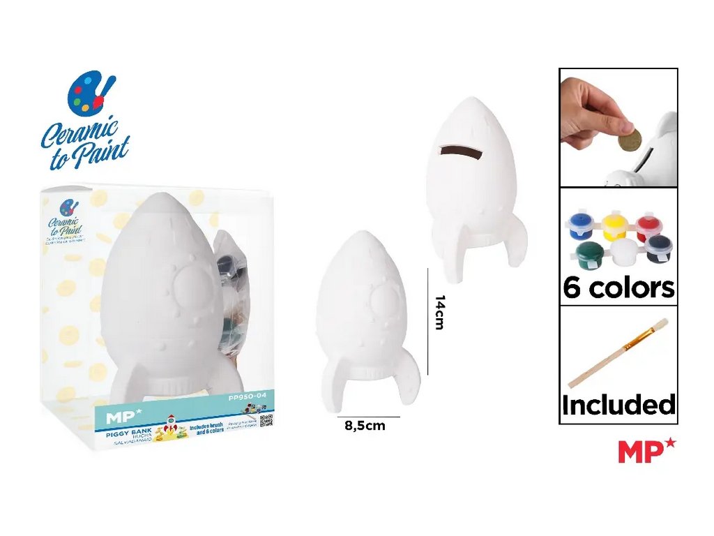 Táto sada obsahuje keramickú pokladničku v tvare psíka, leva, rakety, dinosaura alebo kolotoča, spolu so štetcom a farebnou paletou.