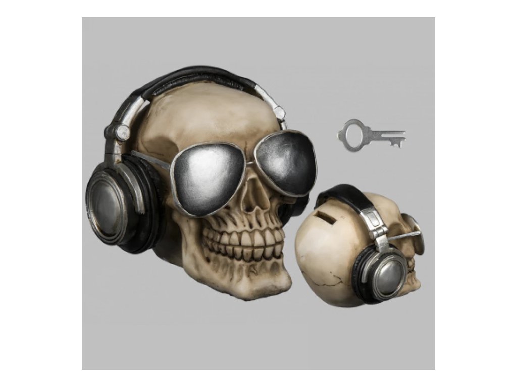 Pre fanúšikov tvrdej hudby a netradičných doplnkov je tu pokladnička v tvare lebky so slúchadlami a okuliarmi. Tento jedinečný kúsok spája funkčnosť s dizajnom – slúži ako praktická pokladnička na mince a zároveň ako originálna dekorácia, ktorá oživí každý interiér.