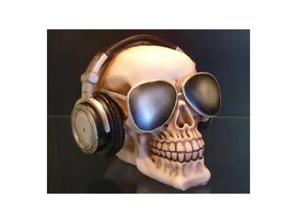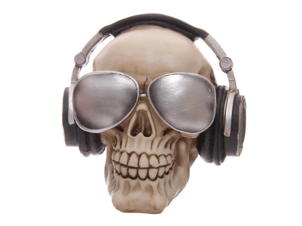 Štýlový dizajn – lebka so slúchadlami a okuliarmi pôsobí realisticky a pritiahne pozornosť každého návštevníka.