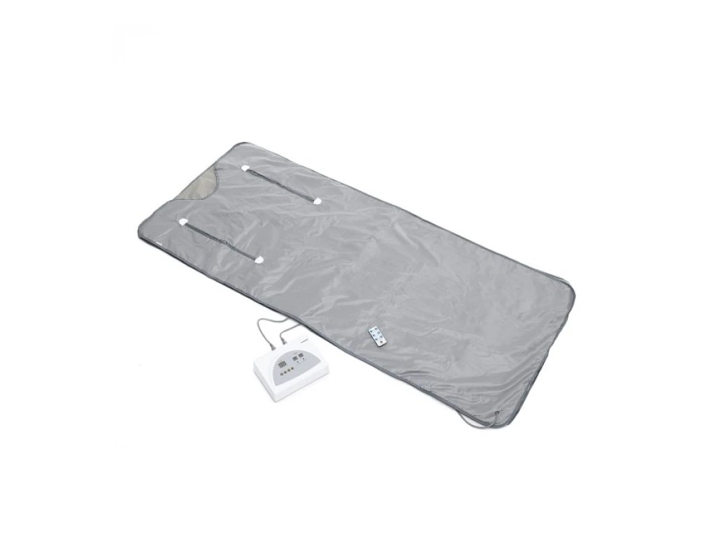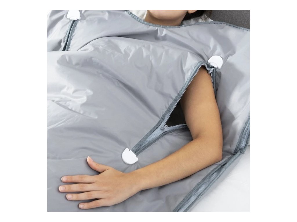 S rozmermi 179 × 79 × 2 cm pokrýva sauna celé telo a vďaka dvom zipsom umožňuje pohodlne vytiahnuť ramená. Teplotu si prispôsobíte podľa potreby v rozmedzí 35 až 80 ºC a časovač sa postará o automatické vypnutie po 30 minútach.